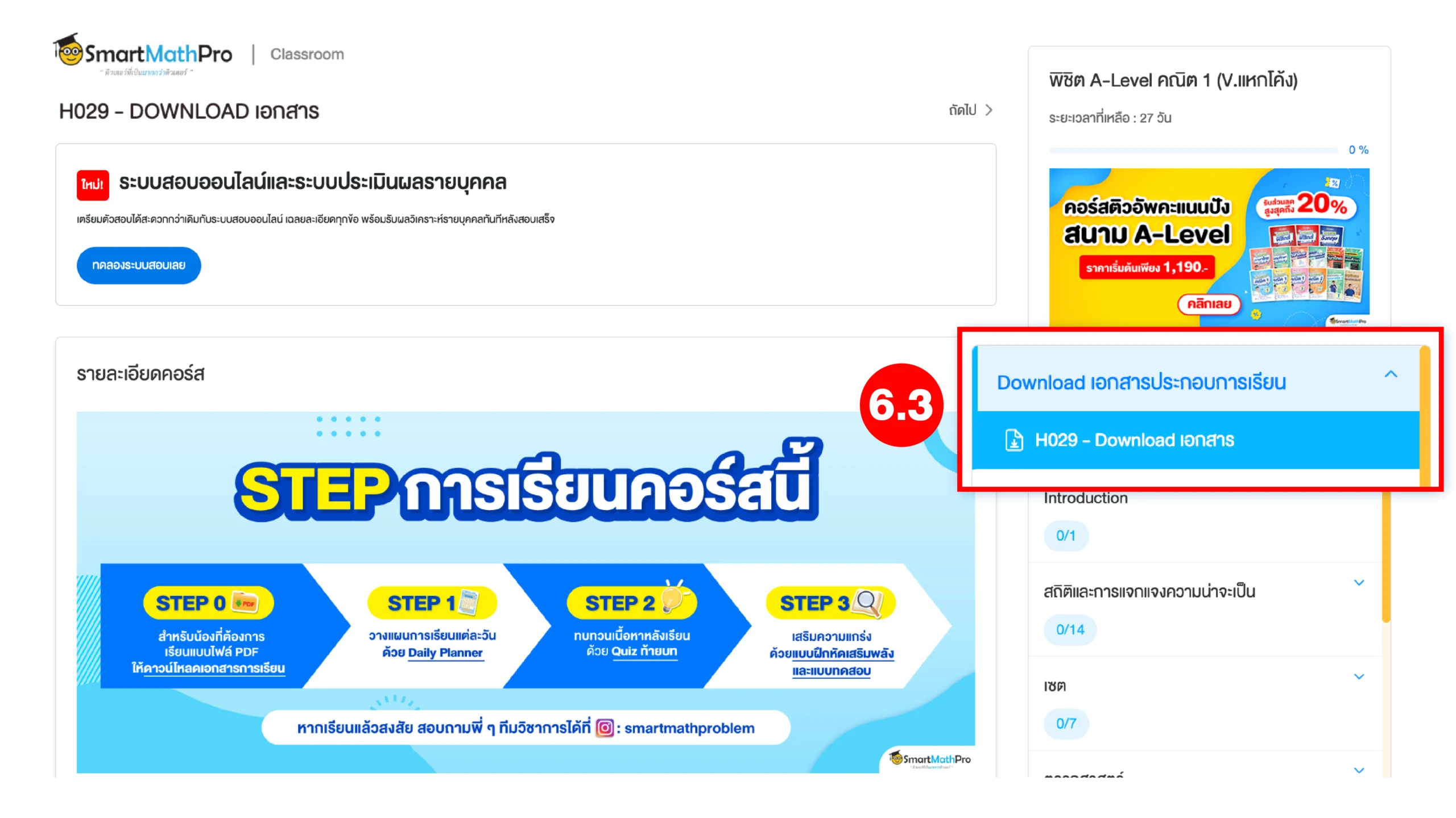 6.3) หากต้องการดาวน์โหลดไฟล์ PDF เอกสารการเรียนและแบบฝึกหัดเสริม (รวมถึงไฟล์เอกสารอื่น ๆ ) สามารถดาวน์โหลดได้ที่หน้าห้องเรียนหรือคลิปแรกของคอร์สนั้น ๆ