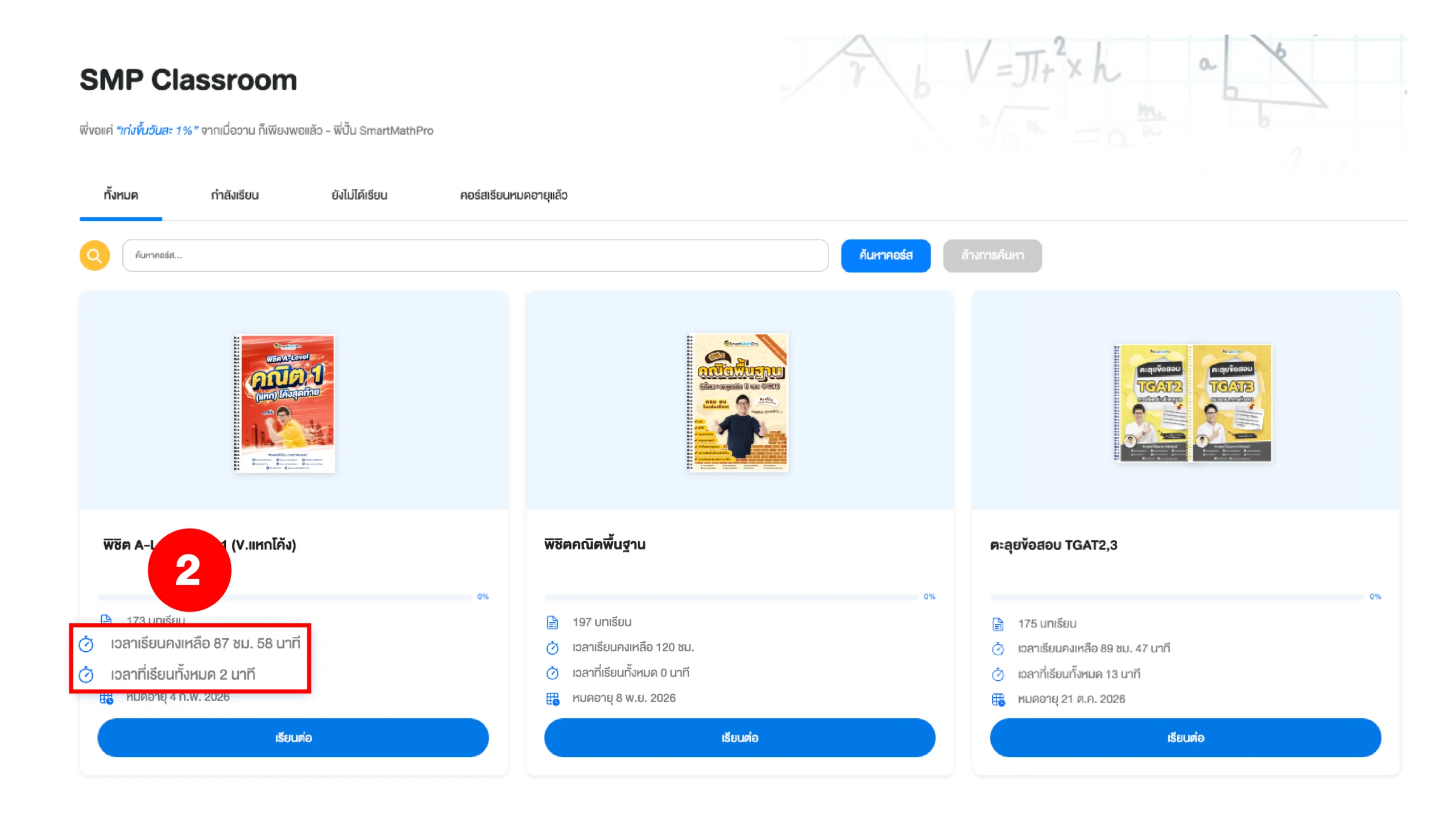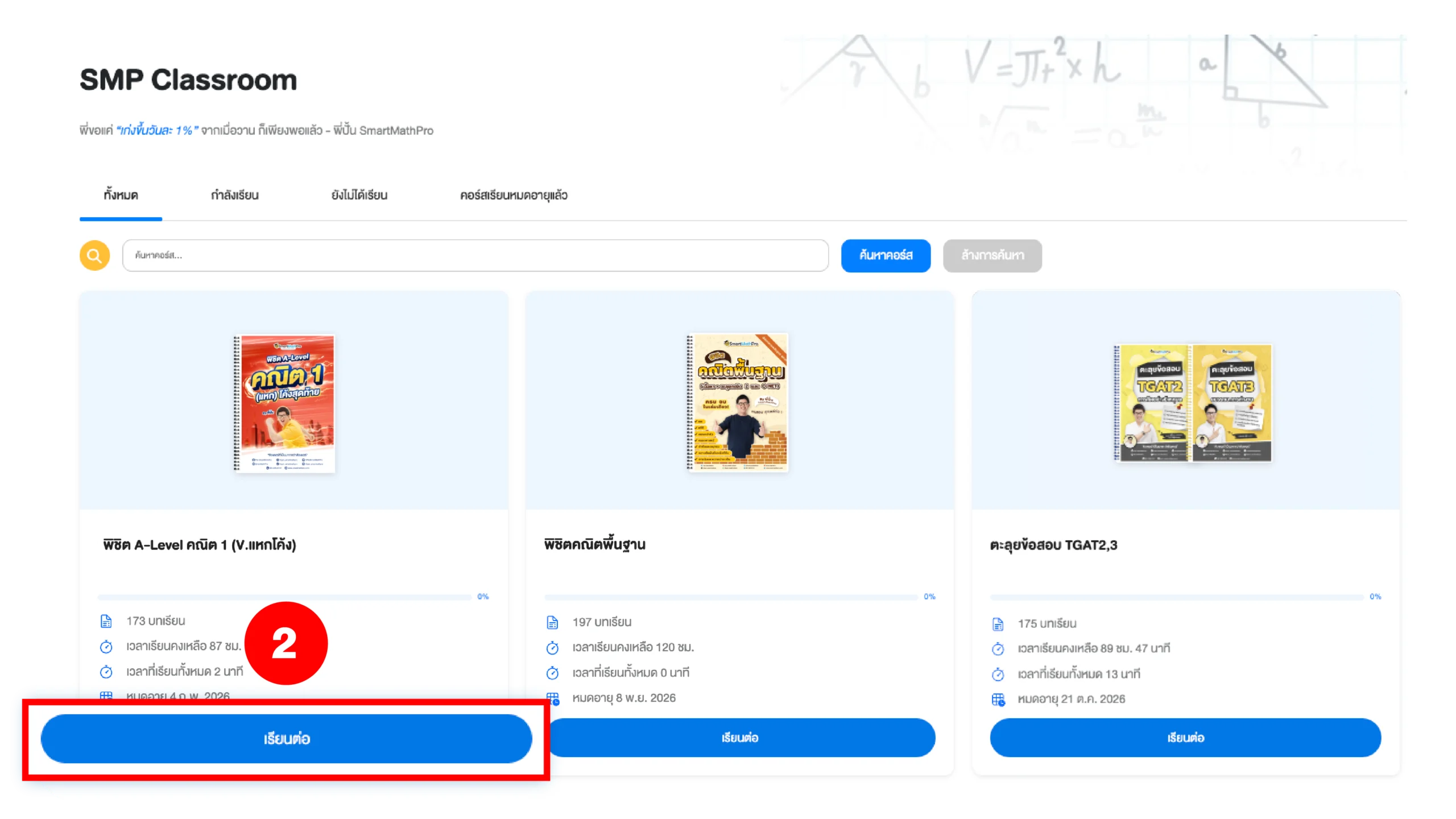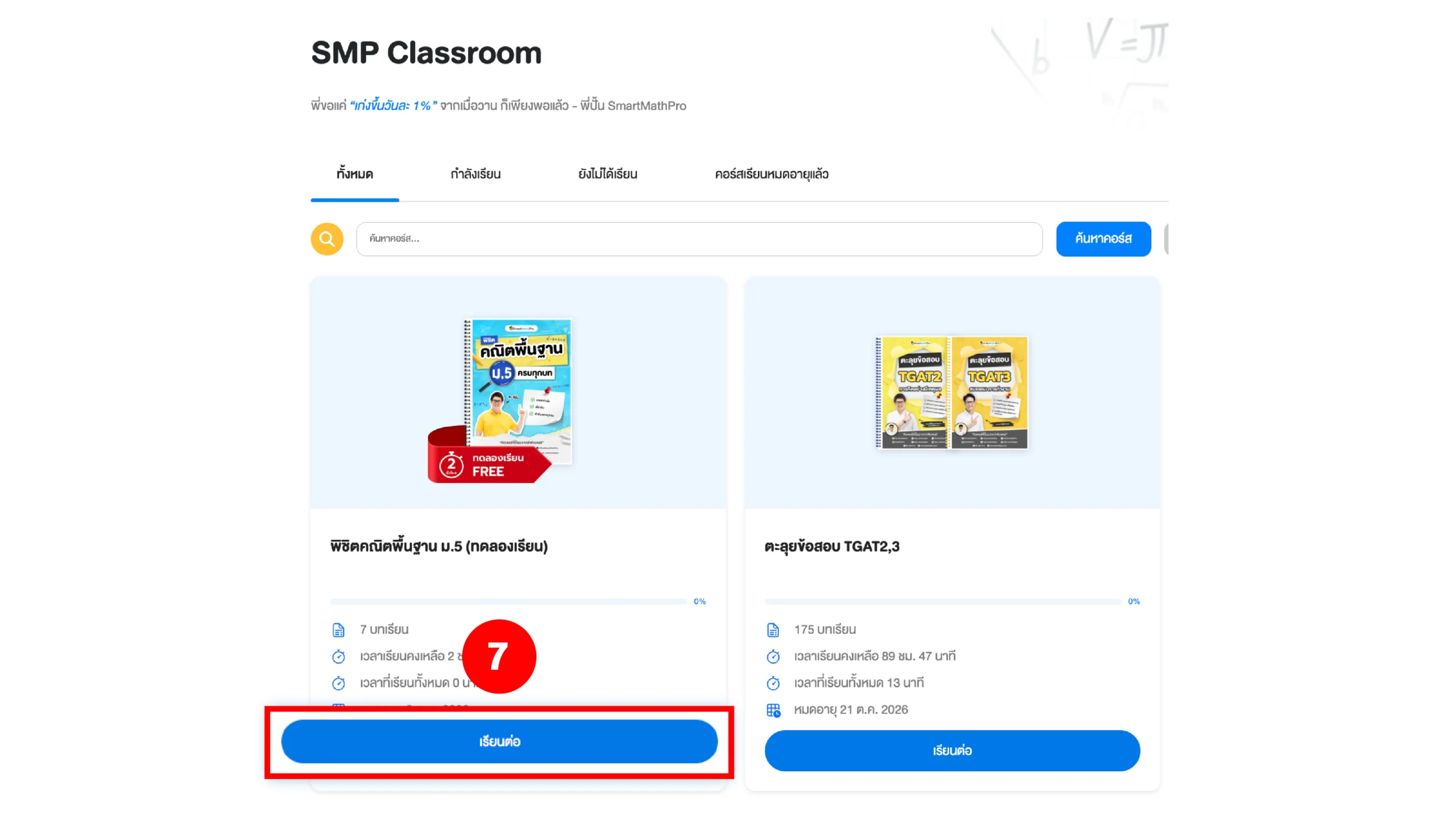 7. เข้าสู่ห้องเรียน ผ่านเว็บไซต์ classroom.smartmathpro.com และเลือกคอร์สที่ต้องการ จากนั้นกดปุ่ม ‘เรียนต่อ’ ได้ทันที