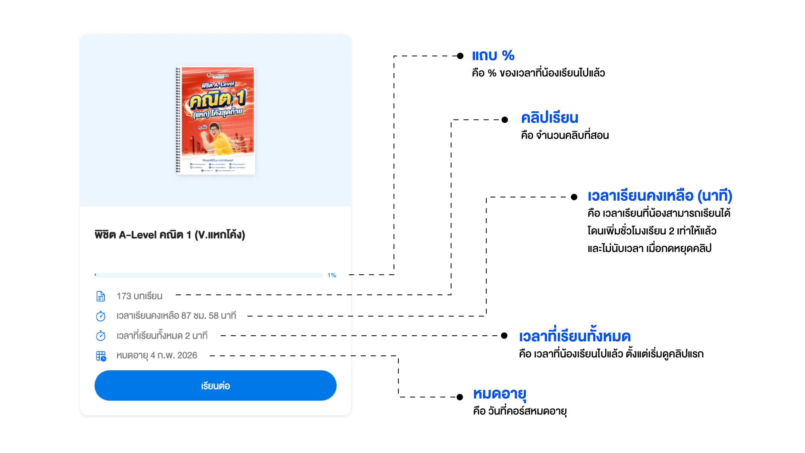 – เวลาที่เรียนทั้งหมด คือ จำนวนนาที ที่น้องเรียนไปแล้วในคอร์สนี้