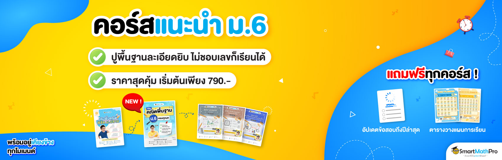 หมายเหตุ : หากแพ็กไม่ตรงตามบทที่โรงเรียน สามารถสมัครคอร์สแบบแยกบทได้ สมัครครบ 2 เล่มขึ้นไป ลด 10% / 3 เล่มขึ้นไป ลด 20% / 5 เล่มขึ้นไป ลด 25% (คอร์สพิชิตคณิตพื้นฐานม.4-6 และปรับพื้นคณิตพิชิตม.ปลาย ไม่เข้าร่วมโปรโมชันน้า)