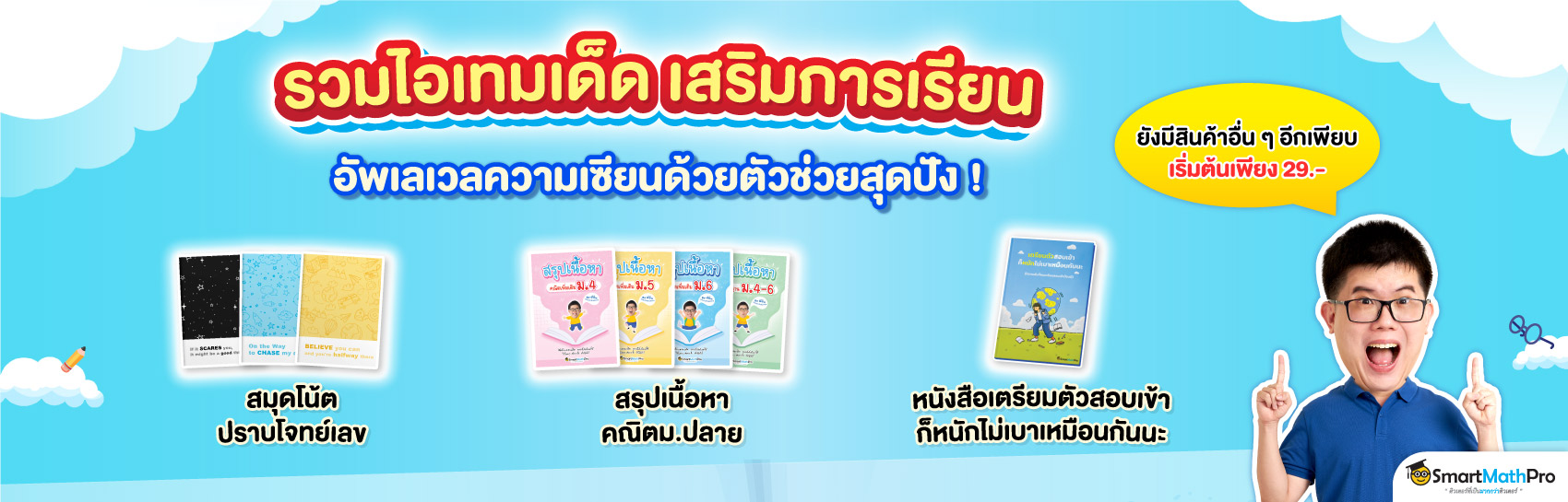 รวมสินค้าพรีเมียมจาก SmartMathPro ไอเทมเด็ด ที่จะช่วยที่มากกว่าแค่เรื่องเรียนให้กับน้อง ๆ มีให้เลือกมากมายทั้งเครื่องเขียน สมุดโน้ตปราบโจทย์เลข (สมุดโน้ต + สรุปสูตร) กระดาษคำตอบ และสินค้าอื่น ๆ อีกเพียบ ลิมิเต็ดเฉพาะที่นี่เท่านั้น รวมถึงหนังสือที่น้อง ๆ หลายคนตามหา “หนังสือเตรียมตัวสอบเข้าก็หนักไม่เบาเหมือนกันนะ” หนังสือเล่มแรก เขียนโดย พี่ปั้น SmartMathPro มาวางจำหน่ายที่นี่แล้ว